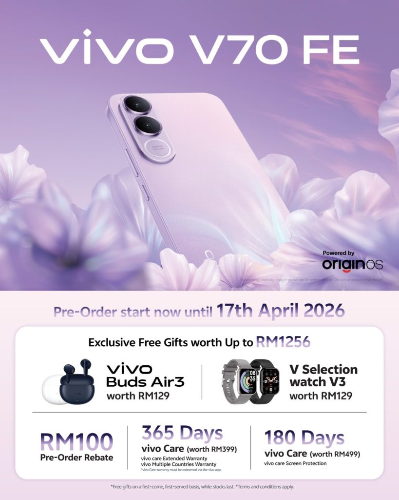 vivo Malaysia 官宣将于 4 月 9 日发布全新“影像小钢炮” vivo V70 FE!新机主打 200MP OIS 超清主摄与 85mm 长焦人像,搭配梦幻“缪斯紫”时尚设计。目前大马预购已开启,下单即送价值 RM1256 的豪华礼包,包括 vivo Buds Air3 及 365 天 vivo Care 保障。