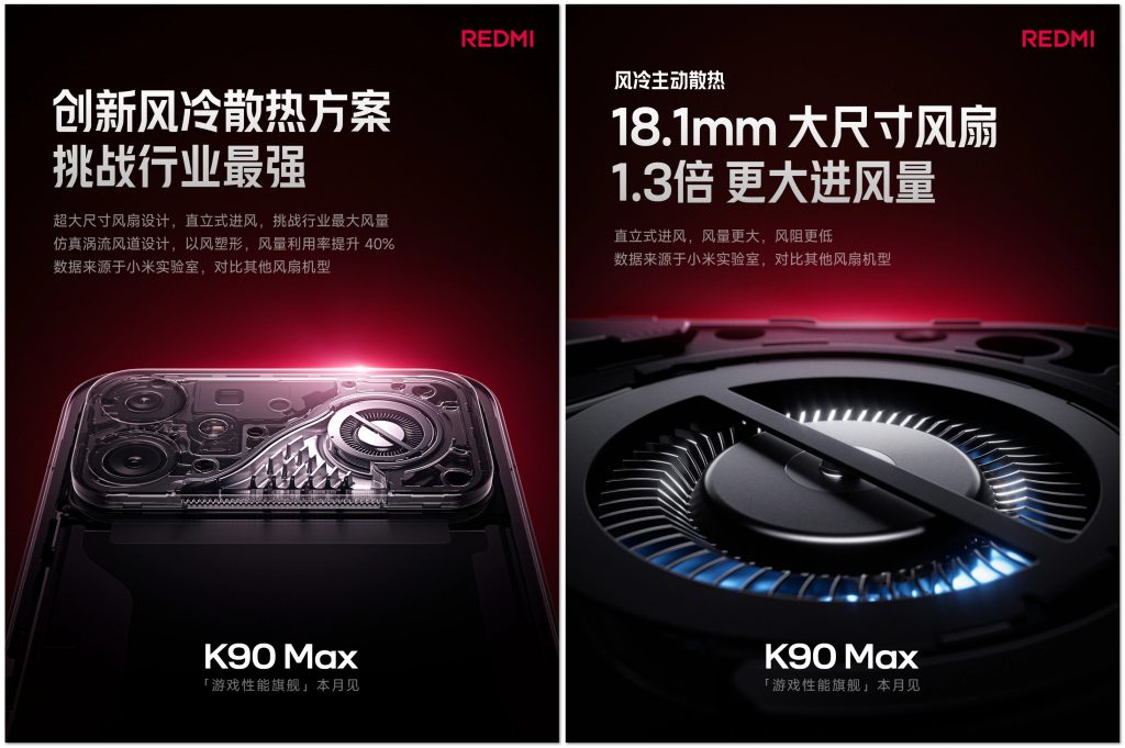 散热是 K90 Max 的核心卖点。根据 IT之家的报道,该机将搭载全新的风冷散热系统,其内置的风扇直径超过目前主流方案 $6\%$。这种直立式进风设计配合前倾扇叶,能够有效增压聚风。